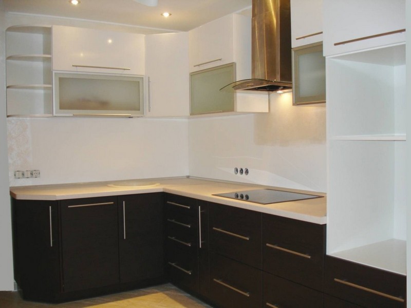 Верхние шкафы угловой кухни могут быть традиционной формы или скошенными. Также можно встретить как открытые полки, так и закрытые шкафы.