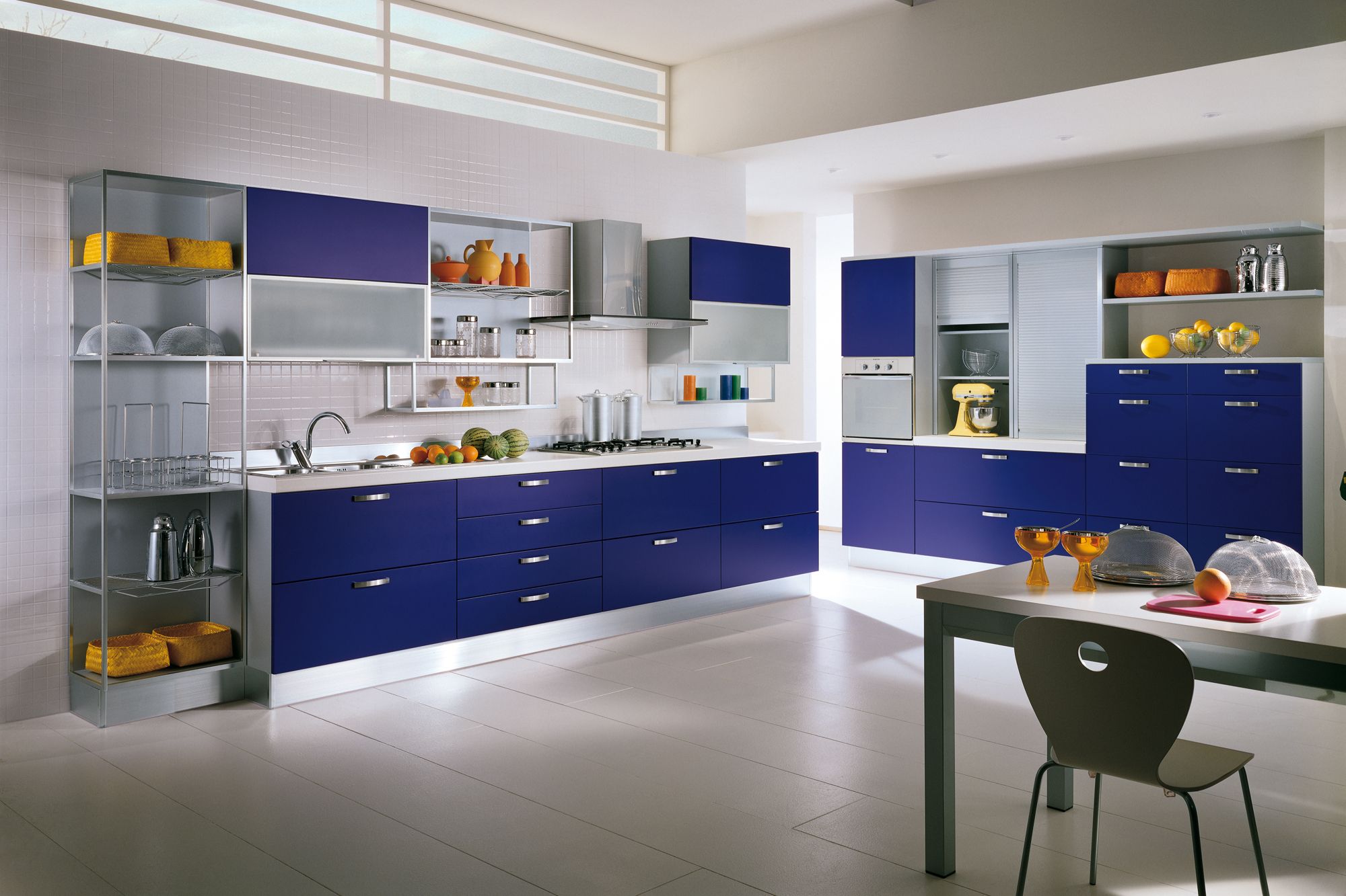Темно-синяя кухня с яркой белой столешницей станет отличным решением для яркого интерьера. А желтая посуда станет ярким и оригинальным акцентом.