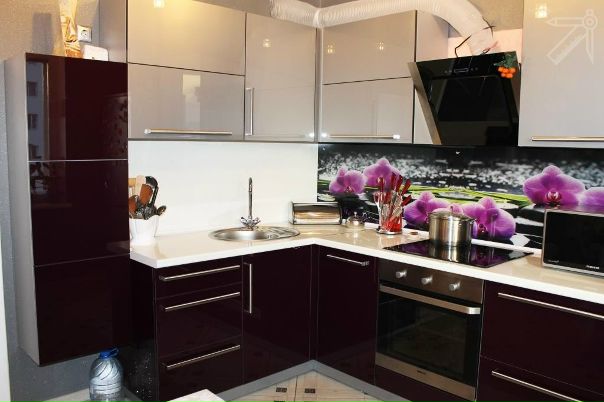 - Акриловые панели, которые изготавливаются на базе ДСП или МДФ. Сперва на основной материал наносят цветное покрытие, а затем отделывают его прозрачным акрилом. Часто встречаются панели с рисунками, которые печатают на специальных принтерах. Акриловые панели обладают теми же свойствами, что и HPL-пластик. Кроме того, они долго служат и не теряют свою привлекательность. Из недостатков можно отметить то, что поврежденные элементы кухни невозможно отремонтировать, и стоит эта красота очень дорого.