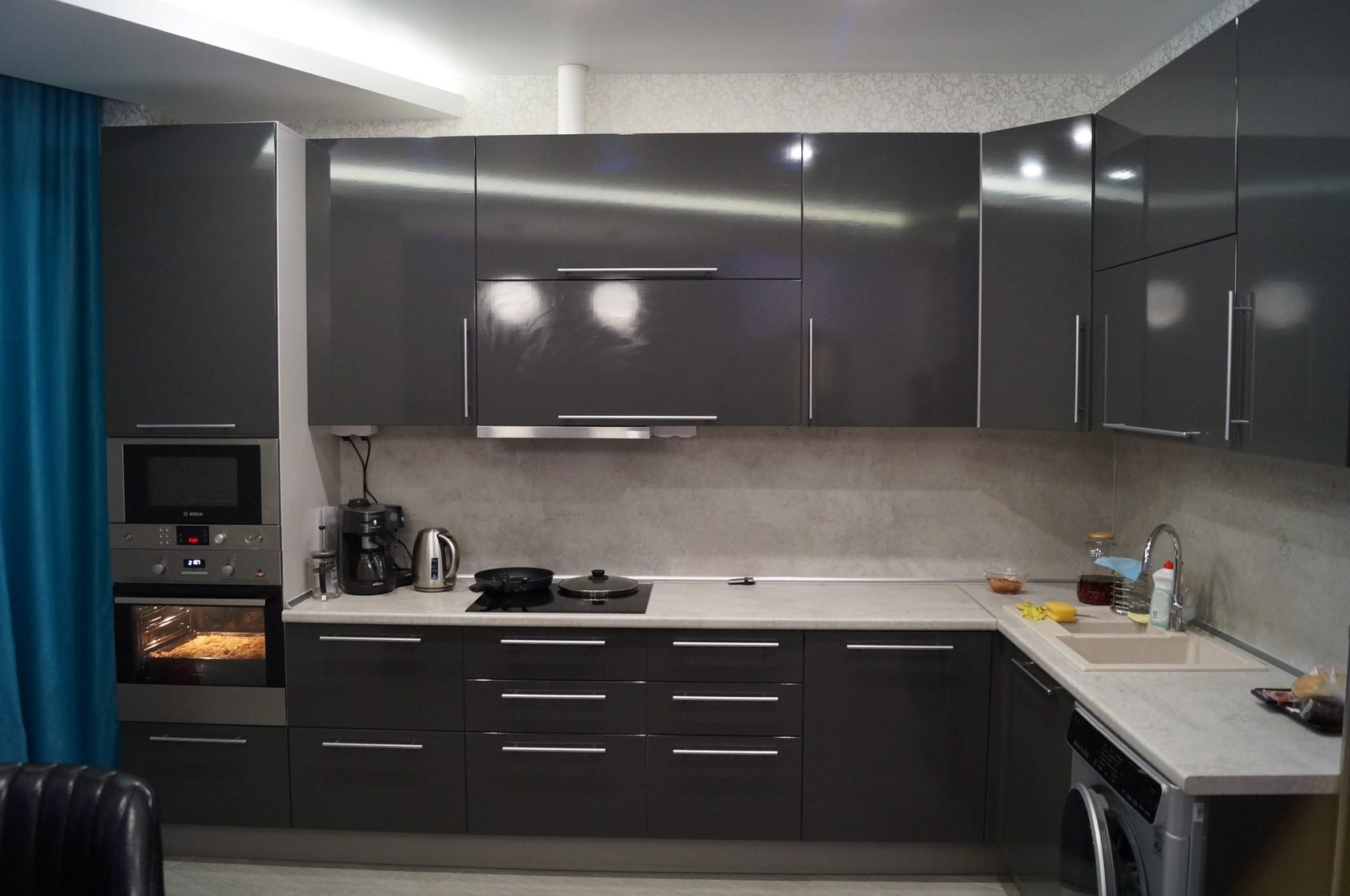 Здорово смотрятся кухни темно-серого цвета в стиле хай-тек или лофт с гладкими фасадами. Вы можете использовать глянцевые или матовые темно-серые фасады. Темно-серые фасады кухни будут сочетаться с деревом темных пород, но не слишком коричневых, таких как венге или темный орех.