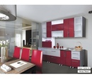 Следующий пример является оптимальным решением для сочетания рабочей зоны и столовой. Красный и белый оттенки применяются как для низа, так и для верха гарнитура. Ярко-красный стол великолепно смотрится в тандеме с белоснежными стульями. Поскольку мебель в основном представлена красным оттенком, то стены, потолок и пол выполнены в белом. Грамотная комбинация цветов создаёт уют и гармонию.