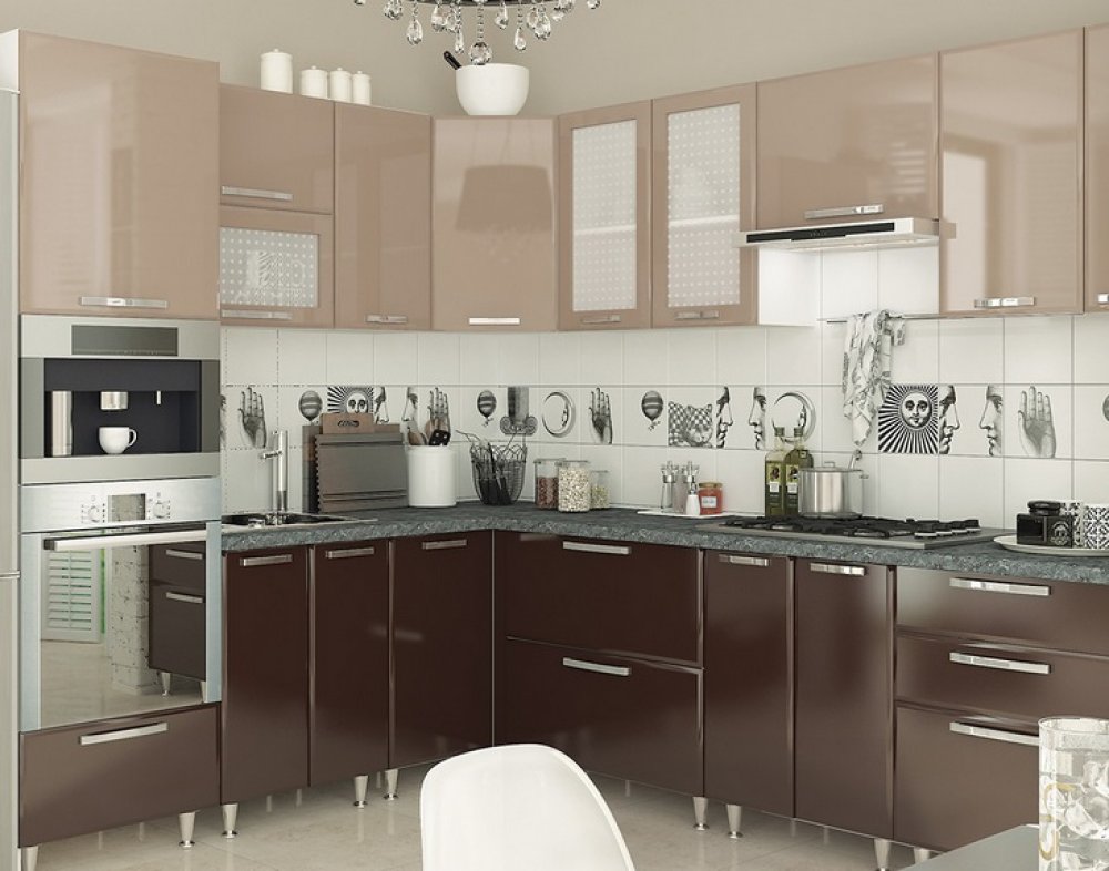 Разнится дизайн и за счет фактуры поверхностей. Кухня цвета капучино может быть глянцевой, матовой, полуматовой, с хромированными, стеклянными либо тонированными вставками.