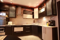 Кухни могут быть одно- и двухъярусными. Вторые варианты отличаются наличием навесных шкафов, в которых хранится посуда, крупы, баночки под пряности, а также другие предметы.