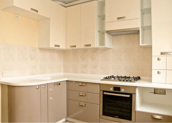 Что касается формы гарнитура, она может быть прямой, угловатой, скошенной, а также округлой. При этом варьируется и дизайн столешниц, который помимо прямых линий может подразумевать фигурные края, сужение рабочих поверхностей к углам гарнитура с целью уменьшения травматичности при передвижении по кухне.