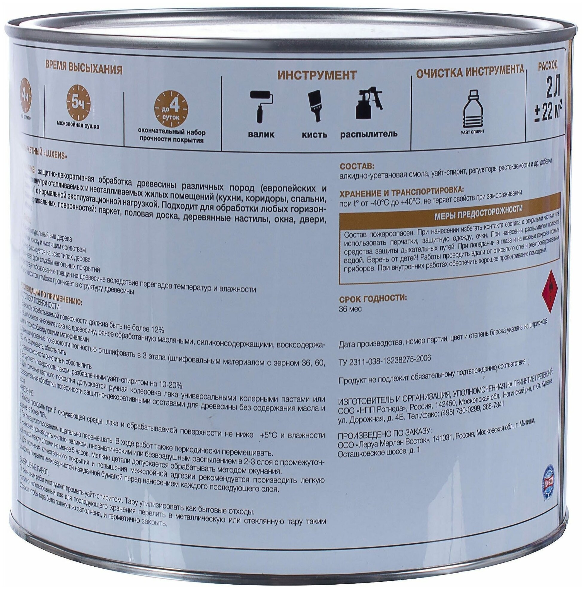 Бесцветный лак на основе алкидно-уретановой смолы. Быстро высыхает. Сохраняет натуральный цвет дерева. Образует глянцевое / полуматовое / матовое покрытие с высокой износостойкостью. Устойчив к кратковременному воздействию воды и бытовых моющих средств.
