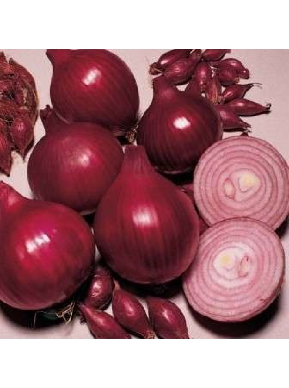 Луковицы округло-плоские, от темно-красного до фиолетового цвета. Вес 100-150 гр.