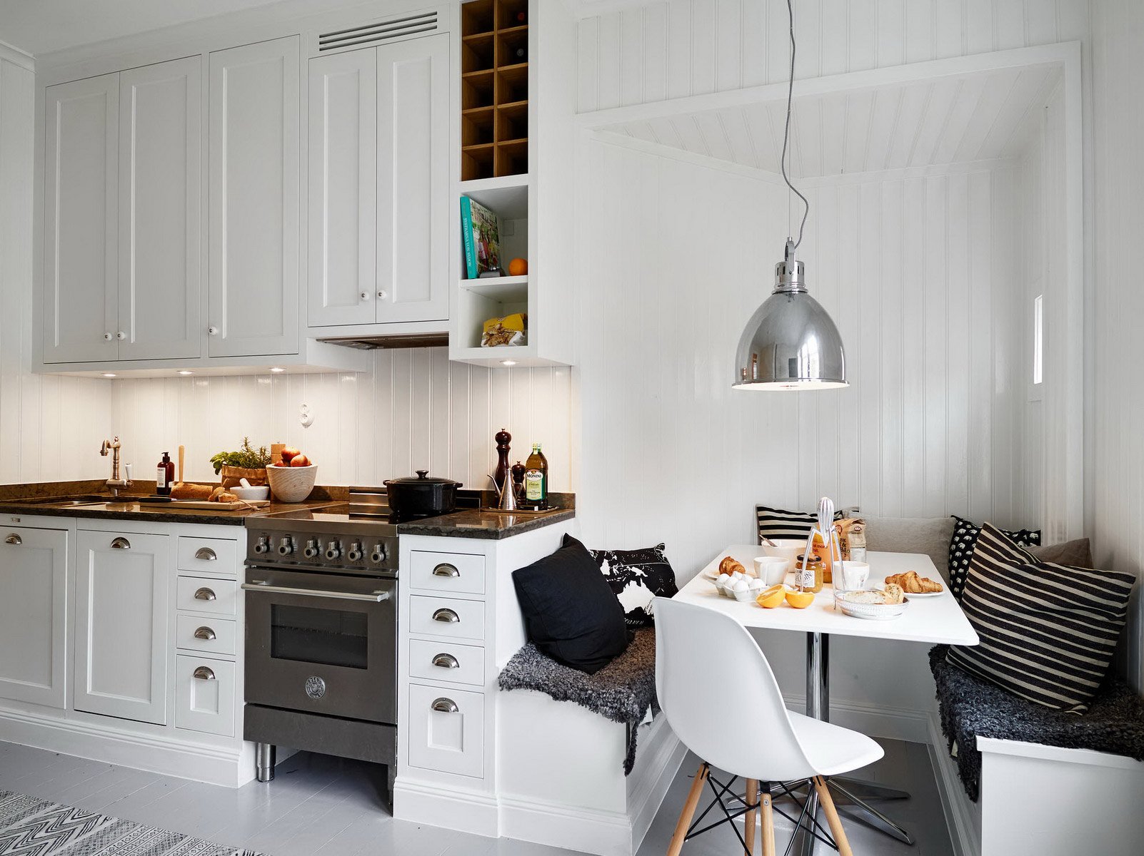 Он может быть очень минимальным и состоять только из элегантного стола посреди вашей маленькой кухни. Вы действительно оживите пространство с помощью современного освещения, которое свисает с потолка.