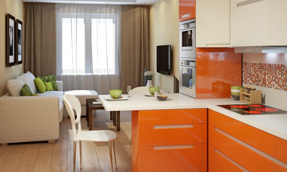 В кухнях, совмещенных с гостиными, часто используются П-образные диваны, с помощью которых разграничивают обеденную и рабочую зоны.