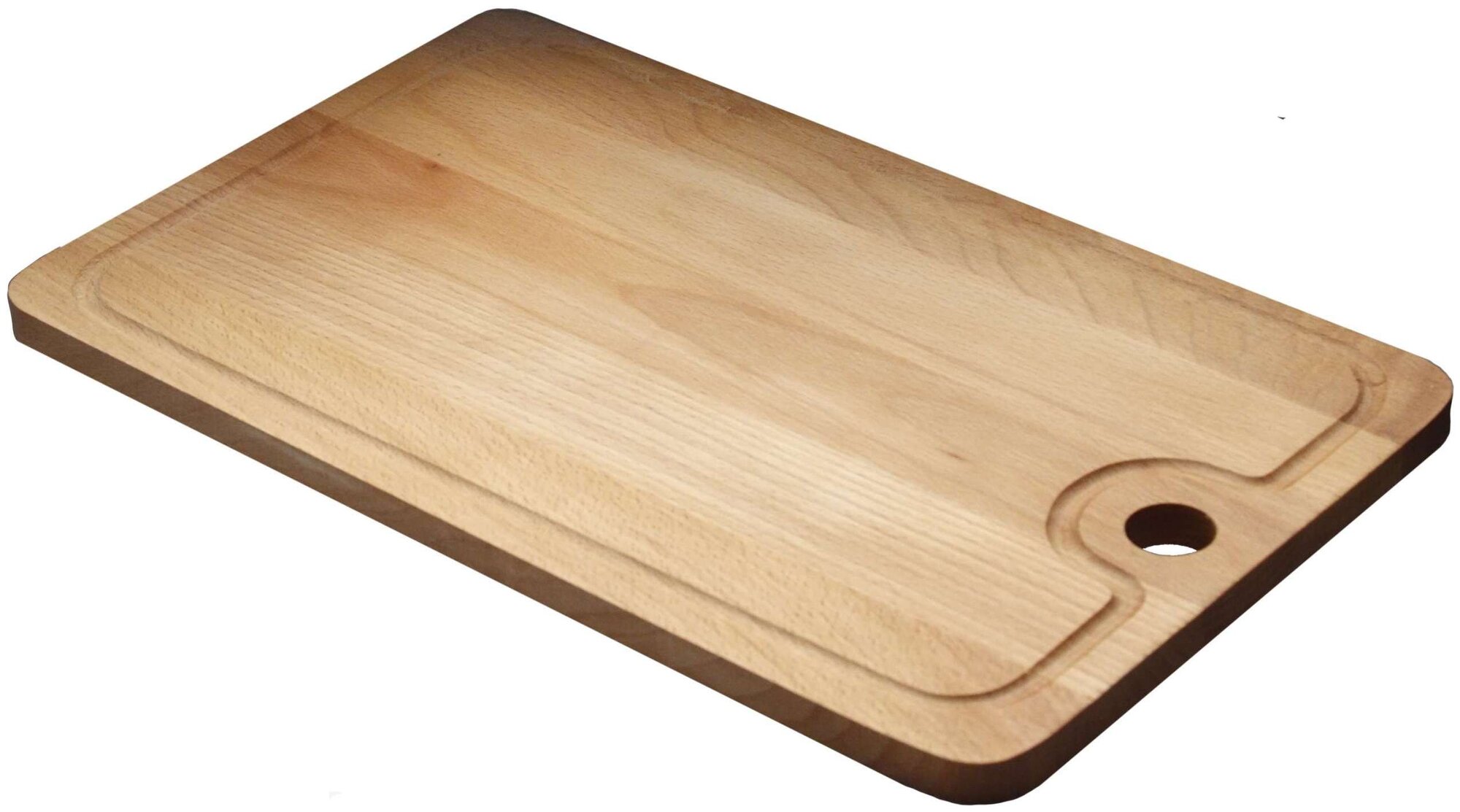 Доска разделочная деревянная. Для изготовления деревянных досок обычно применяются береза, сосна, бук, гевея, акация и дуб. Они красивы, удобны и относительно долговечны. При выборе доски обратите внимание на толщину доски – она должна быть не менее 10 мм, и на то, как соединены между собой отдельные части. Лучше всего, когда крепление выполнено не просто встык на клею, а с помощью сложного фрезерованного паза. В идеале деревянная доска должна быть склеена из брусочков, поставленных на торец, но такие доски, как правило, довольно дороги.