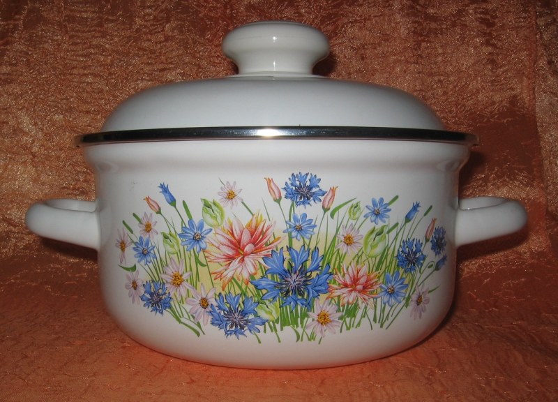 Поскольку эмалевый слой не реагирует, в эмалированной посуде можно готовить различные блюда, не опасаясь выщелачивания.При разрушении эмалевого покрытия внутренняя поверхность перестает быть инертной, и железо из сердцевины кастрюли может попасть в пищу.
