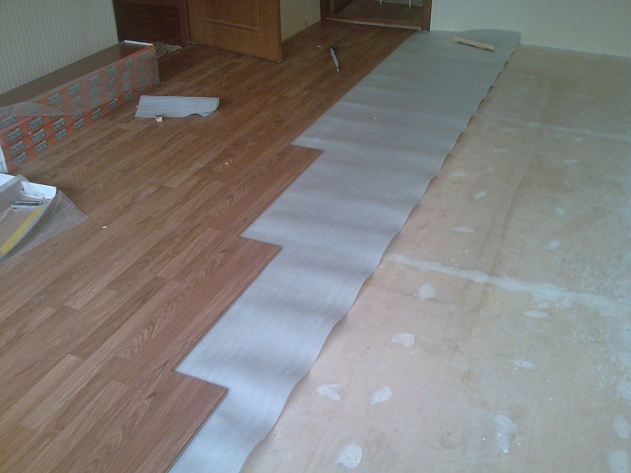 Толщина листов подложки выбирается пропорционально перепадам высоты – если они незначительны, можно взять фанеру толщиной от 5 мм. Листы подложки следует стелить со смещением примерно на пол-листа (в виде кирпичной кладки), с зазором около 10 мм около стен. Подложка помоет и сгладить неровности, и утеплить пол.