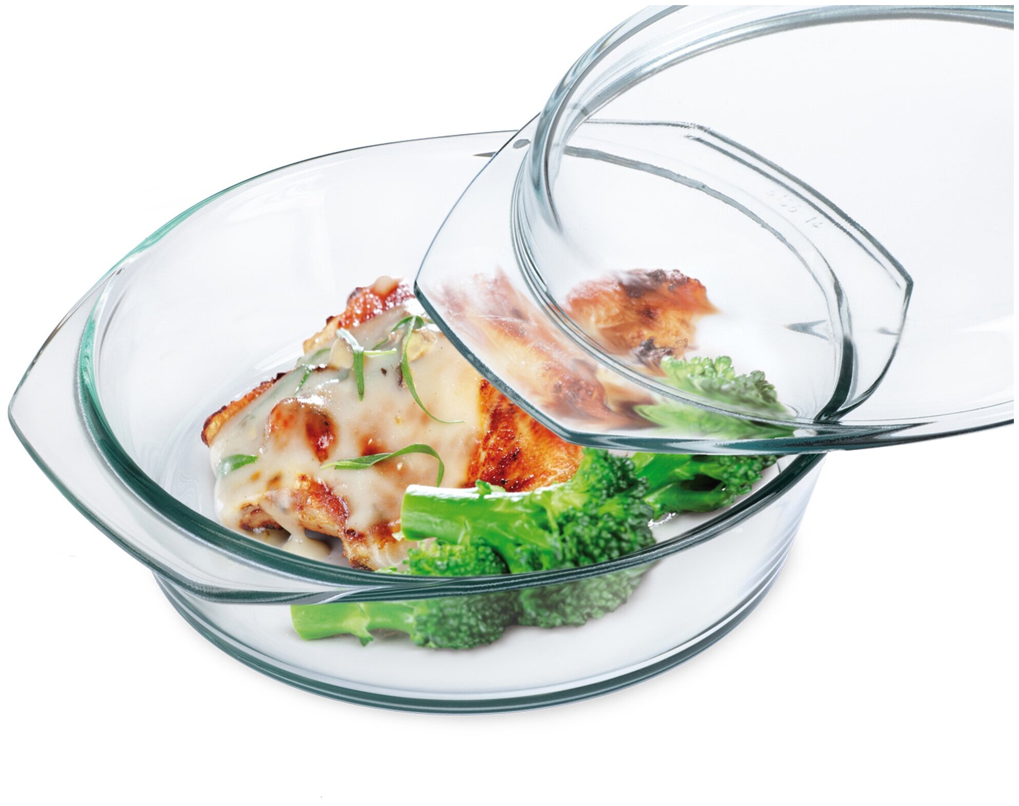 Важная особенность: толстое стекло сохраняет тепло длительное время, так же как и чугун, а потому идеально для вторых блюд. Еду в нем можно не только готовить, но и хранить – стекло безопасно для пищи и не вступает с ней в химическую реакцию, отлично сохраняет вкусовые качества блюд.