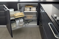Для углового шкафа с дверцей самым удачным вариантом является установка секции с дверцей нараспашку. Если сравнивать такое наполнение кухонного шкафчика с «каруселью», то оно более вместительное. Конструкция такого уголка представлена в виде поворачивающегося механизма, соединяющего между собой ящики прямоугольной формы. Крепление ящичков устанавливается на дверцу кухонного шкафа, причем к двери прикрепляются передняя часть ящичков. Такие ящики имеют сетчатое строение и поэтому все находящиеся внутри них доступно для обзора, вы легко можете увидеть и достать необходимую вам вещь. Когда вы закрываете дверь шкафчика, эти ящики зарываются вместе с ними в правильном порядке.