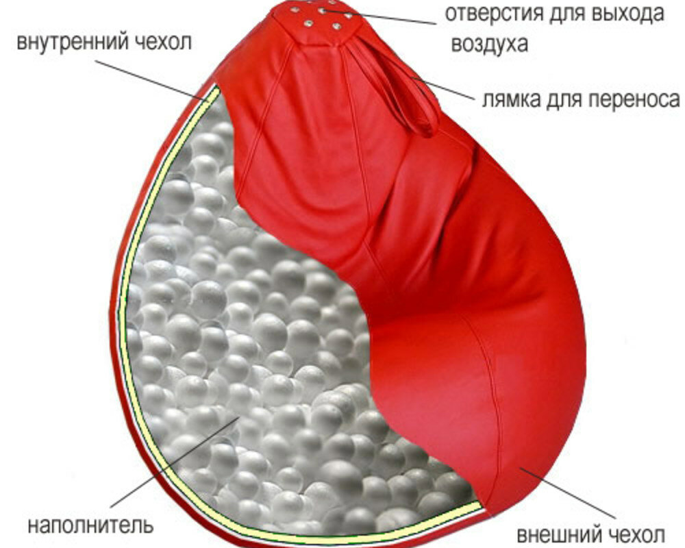 Сегодня в качестве структурных элементов для кресел-мешков используют множество материалов. Самым популярным считаются шарики пенополистирола. Ими наполняют практически всю заводскую мебель.