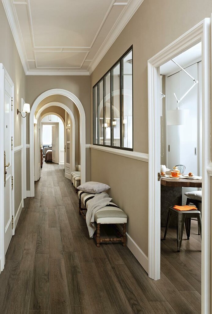 Это один из лучших вариантов для проходных комнат. Керамика производится из глины, обжигаемой при высоких температурах. За счет запекания она становится очень плотной и прочной, с легкостью выдерживая серьезные нагрузки. Плитка и керамогранит может быть абсолютно разных форм, размеров и цвета — вы всегда можете подобрать подходящий вариант. Также она бывает глянцевой и матовой, глазурованной и неглазурованной, покрытая эмалью и др.