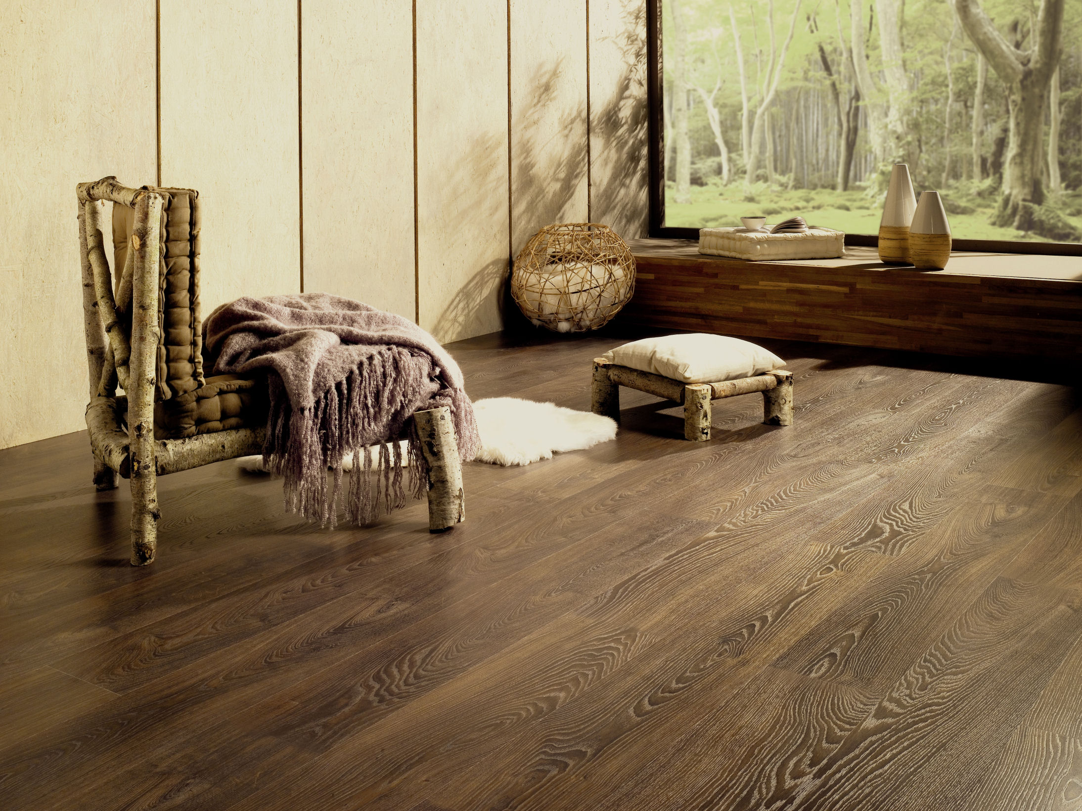 Ламинированный пол изготовлен из фанеры с тонким шпоном твердых пород дерева сверху. Поверхность ламината имеет изображение реалистичной текстуры древесины, защищенной прозрачным «слоем износа». Ламинат — обычно самый дешевый способ добиться эффекта дерева.