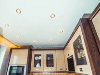 Главное требование, предъявляемое к натяжным потолкам в этой комнате – это высокая влагостойкость. Она нужна не только для того, чтобы потолок мог монтироваться в помещении с повышенной влажностью, но и для того, чтобы вы могли легко его отмыть от копоти и жира.