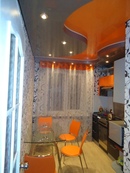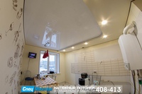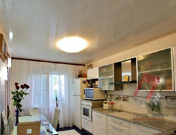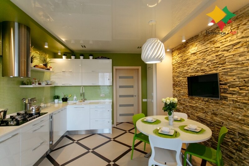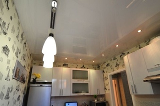 - Для очень низких и маленьких кухонь лучше выбрать светлые глянцевые потолки. Они будут визуально улучшать габариты комнаты, расширяя её и увеличивая высоту.