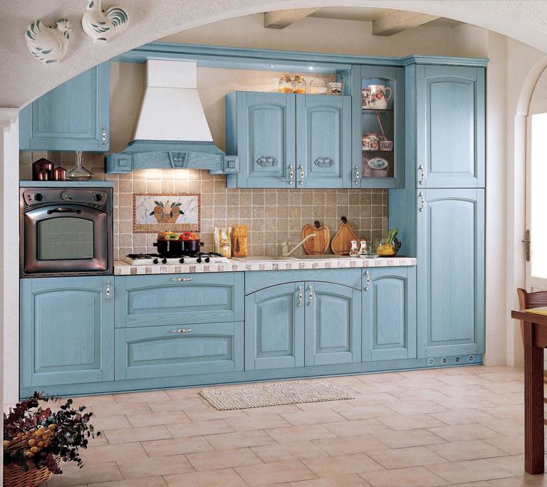 Кухонные гарнитуры в этом стиле изготовлены из натурального дерева или МДФ. Для отделки иногда используют вставки из керамики, стекла и других материалов. Кухонный гарнитур, окрашенный голубой краской, идеально подходит к средиземноморскому стилю.