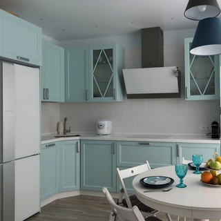 Голубая кухня вызывает ассоциации с излишней строгостью и прохладой, которые совсем не уместны в этом помещении.