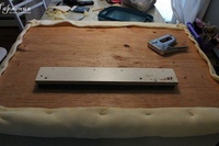 Если вы используете два слоя ткани, как в нашем случае, можно после того, как первый слой готов, найти, сверившись с записями, места для креплений, и обозначить их, ввернув и вывернув шурупы. Нащупать эти отверстия потом будет проще.