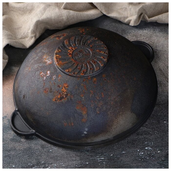 Первым делом поставьте казан на довольно сильный огонь и оставьте его в покое. Скоро от него пойдет дым — это будут выгорать остатки машинного масла, которое использовалось при литье.
