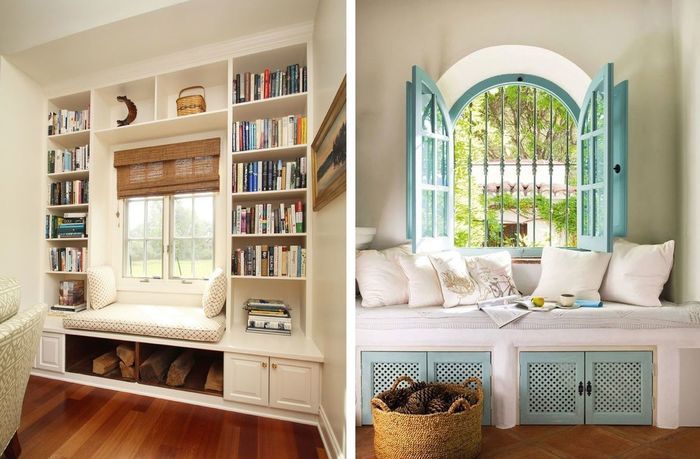 Сама конструкция может представлять собой полки, стеллажи или дверцы с элементами стекол или все вместе. Такое решение с разными элементами может превратить окно в настоящую жемчужину вашего дома.