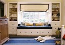 В данной комнате, конструкция, установленная рядом с оконной зоной, предоставляет максимально эффективное размещение игрушек, принадлежностей для занятий и других вещей. При оборудовании шкафчиков в первую очередь учитывают возраст и рост ребенка, для того, чтобы он имел свободный доступ ко всем ящиками и полкам, а также критерии безопасности, которые предполагают отсутствие острых углов.