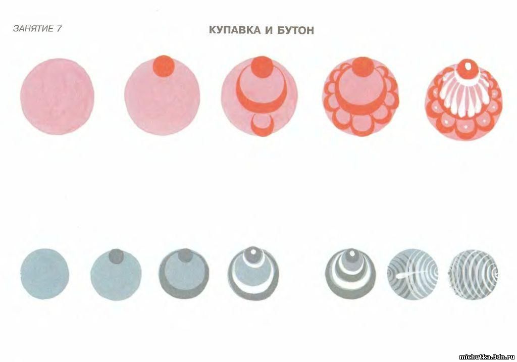 Кружочки для розы крупнее, для купавки — меньше. Этот начальный этап работы мастера над композицией картины называется живописью. Одна краска яркого цвета (красная, оранжевая, синяя и т.), другой белый. Цветной силуэт венчика получается при смешивании белого с одним из ярких цветов.
