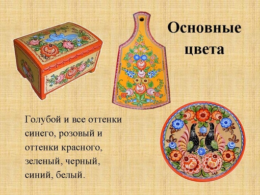 Городецкая роспись выделяется следующими основными цветами для нанесения любого изображения: