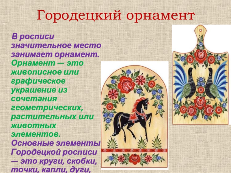 Городецкий орнамент Значительное место в росписи занимает орнамент. Орнамент – это изобразительное или графическое украшение, составленное из сочетания геометрических, растительных или животных элементов. Основными элементами городецкой росписи являются круги, скобки, точки, капли, дуги, штрихи, спирали.