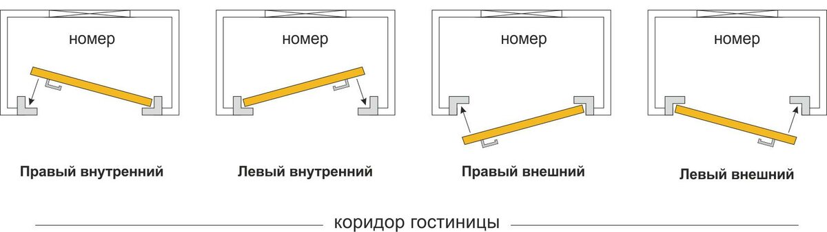 Если проход ведет в коридор, по которому часто ходят люди, исходя из правил безопасности, створки отворяются внутрь комнаты. Иначе возможно травмировать тех, кто проходит мимо них.