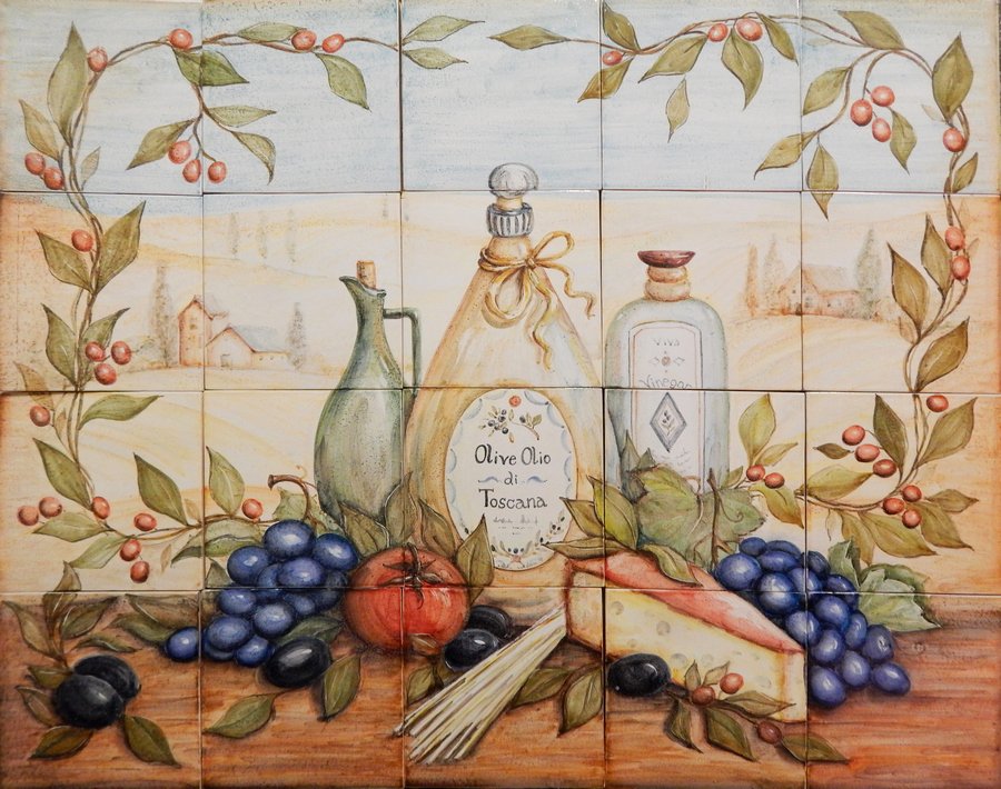 Панно, которые расписаны вручную, выкладываются с использованием крупной кафельной плитки для кухни. Плитка панно для кухни покрывается рисунком, после чего плитку обжигают и покрывают глазурью.