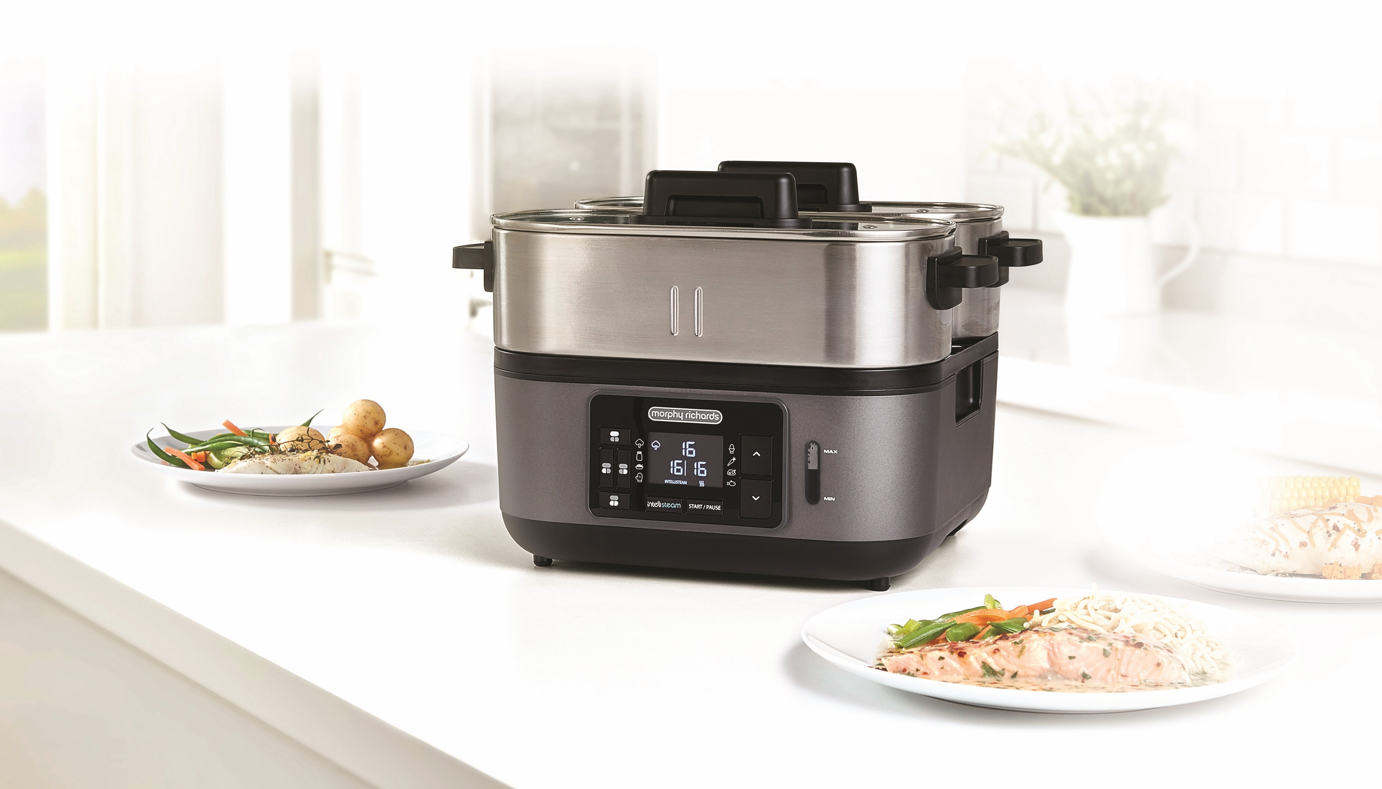 Управление здесь цифрового типа, оборудование обладает таймером на один час, после окончания приготовления устройство автоматически отключится, но при необходимости будет поддерживать высокую температуру пищи. Сборка очень качественная, все чаши, решетки и прочие съемные элементы разрешается мыть в посудомоечной машине. Емкость воды обладает объемом в полтора литра, чего вполне достаточно для готовки одновременно трех блюд. Если же воды будет не хватать, то прибор самостоятельно выключится, издав при этом звуковой сигнал.