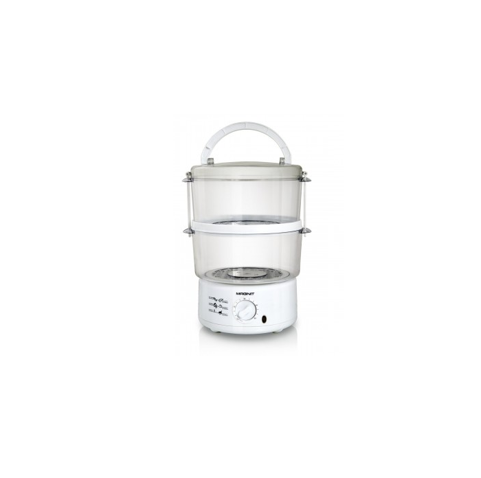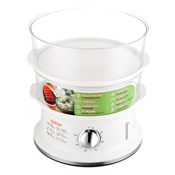 С нижней стороны основания располагаются вентиляционные отверстия, обеспечивающие доступ свежего воздуха и не позволяющие перегреваться элементам устройства. Резиновые ножки обеспечивают устойчивость прибора практически на любой поверхности. Продукция оборудована двумя корзинами для продуктов, суммарный объем которых составляет 4 литра. За счет такого конструктивного решения можно готовить одновременно два блюда. Пользоваться пароваркой гораздо проще и легче по сравнению с варочной поверхностью, на приготовление еды придется потратить значительно меньше времени. Мощность прибора составляет 800 Вт.