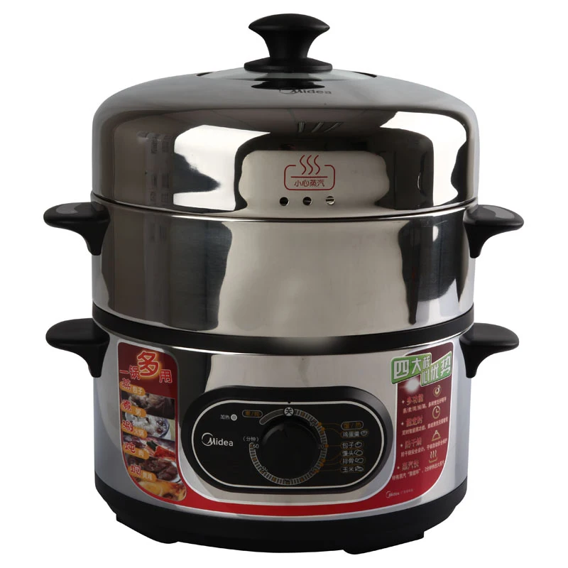 Открывает наш рейтинг довольно оригинальная и очень долговечная модель. Она имеет две чаши, объем каждой составляет порядка 3 литров. Их изготавливают из безопасной для человеческого здоровья нержавеющей стали. Крышка выполнена из особого закаленного стекла. Кроме того, в комплекте есть и пластиковый контейнер, используемый для приготовления риса. Включается устройство поворотным переключателем, который к тому же выполняет функцию таймера. Имеется отсек для долива воды, поэтому работу пароварки можно будет не прерывать. Устройство отключается самостоятельно после того, как закончится время приготовления блюда. Она оповещает пользователя об этом специальным звуковым сигналом.