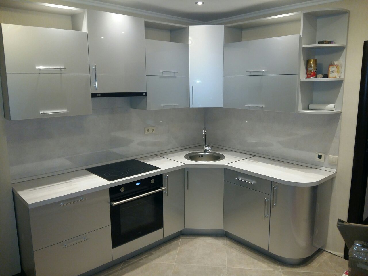 Глянец – самый популярный вариант, судя по отзывам, так как матовое покрытие выглядит не столь эффектно. Однако с глянцевой поверхности сложнее убирать следы жира и грязи, а, вернее говоря, это приходится делать чаще. Второй минус такого решения – акрил можно закрепить только на ровные поверхности, так что фрезерованные или гнутые фасады на угловой кухне исключаются.