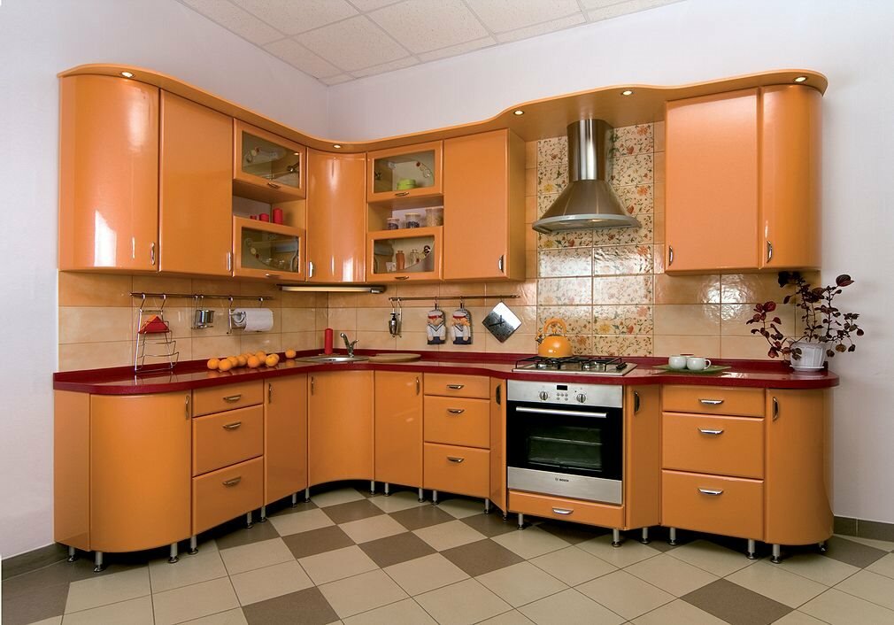 Цветовая гамма – неограниченная. Более того, здесь возможен не только рисунок дерева или камня, но и плавный переход оттенков, создающий дополнительные цветовые эффекты. Как правило, при оформлении такой мебели выбирают яркие сочные цвета и комбинируют их с нейтральными. Акриловая пленка может быть матовой, но на практике такое решение выбирают редко: глянец усиливает цвет, придает самому гарнитуру легкость и отражает свет, позволяя зрительно увеличить пространство кухни. Еще один плюс – акриловая пленка приклеивается к гнутым фасадам, которые эффектно смотрятся в угловых кухнях. На фото приведен пример.