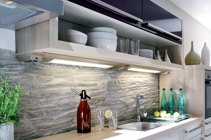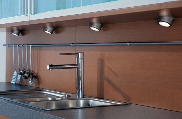 Обычно такая подсветка на кухню под шкафы делается над рабочей зоной, где осуществляется процесс приготовления пищи. Этот вариант размещения подсветки обеспечивает легкость выполнения различных работ на кухне, так как будет хорошо видна столешница. Наиболее часто под навесные шкафы используются особые встраиваемые мебельные светильники со светодиодными лампочками. Допускается для этого Led подсветка, но она должна быть мощной и качественной, чтобы обеспечить действительно яркое освещение;