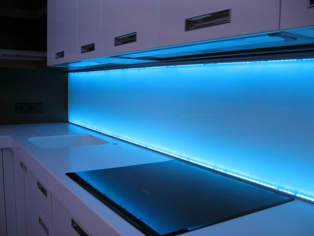 Толщина этого профиля, в который вставляется стекло, составляет 8 мм. Так, свет будет «течь» сквозь стекло, отражаясь от краев поверхности. При этом сама лента остается незаметной. Преимущество такой методики в том, что светодиодная лента не излучает УФ, поэтому ее можно использовать в качестве альтернативы или дополнения к основному освещению жилища. Кроме лент также можно использовать точечную подсветку, которая значительно проще, а для сложных вариантов можно применить модульную светодиодную подсветку.