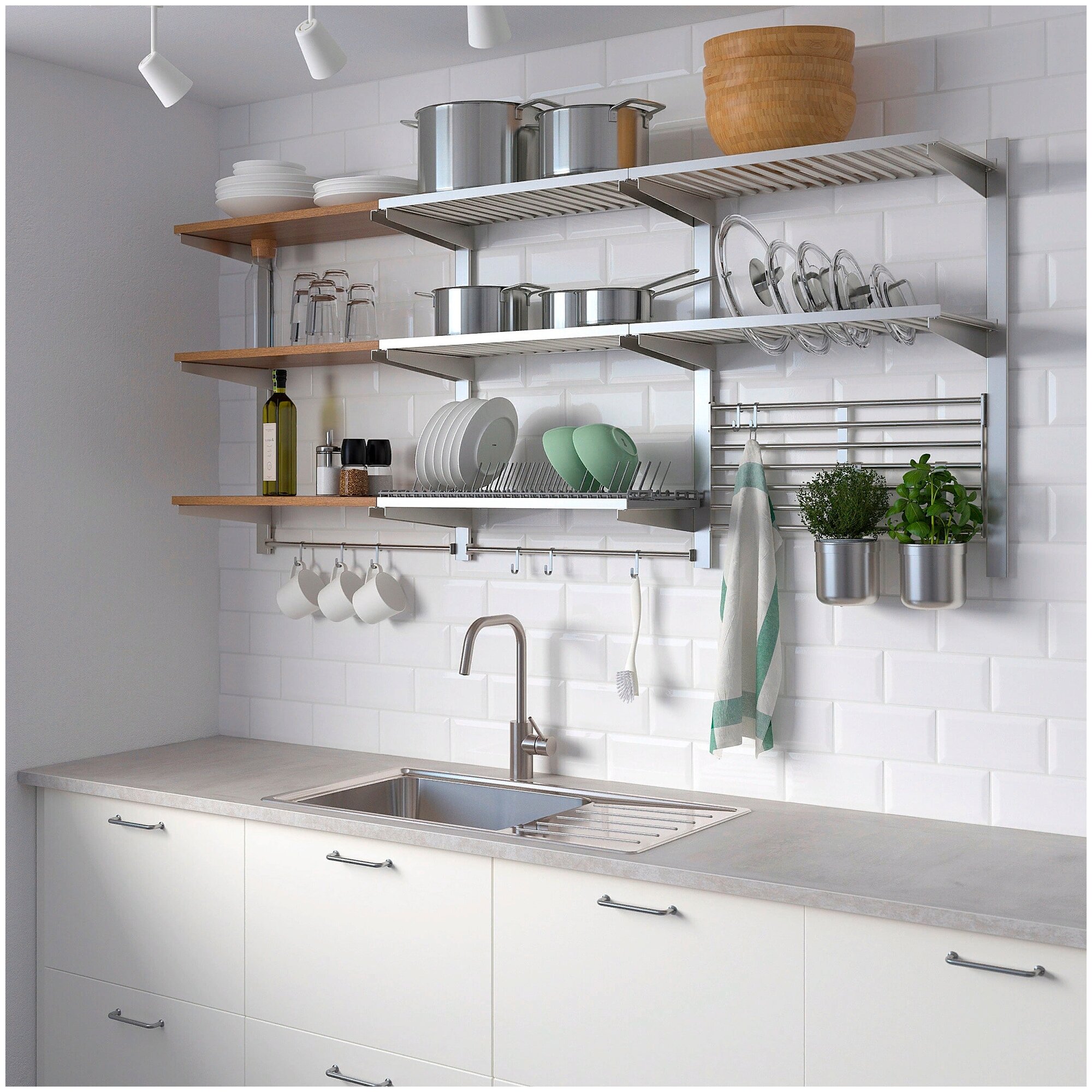 9. Эти длинные полки из того же материала, что и фартук, расположены над раковиной и стойкой, чтобы обеспечить удобное место для хранения кастрюль, сковородок, тарелок и кружек.