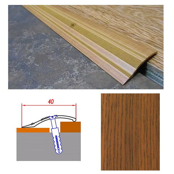 А для устройства межкомнатных порогов используются готовые металлические профили разного сечения. Крепиться они могут наружным способом через сквозные отверстия или скрытым способом с помощью специальных вставок.