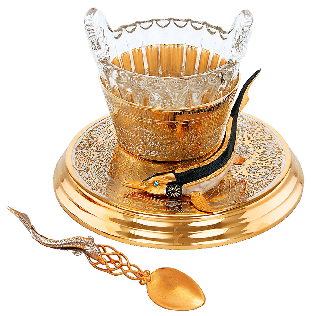 серебряная посуда, декорированная финифтью, хрустальные модели с ложкой и крышкой, икорницы «Рыбка» и «Белуга»