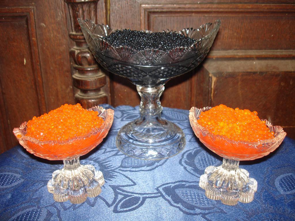 Если стол большой, а гостей много, можно приобрести несколько одинаковых икорниц и распределить их по всей площади. Так каждый будет иметь лёгкий доступ к деликатесу, а вы сможете гордиться гармонично оформленным застольем.