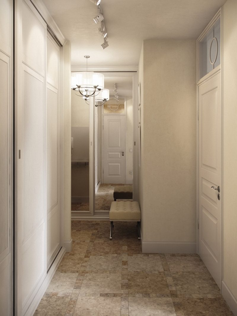 Пол на входе лучше выложить керамической плиткой, а затем можно оформить его светлым паркетом. Так можно грамотно провести зонирование, разделив даже маленькую прихожую на входную зону, место для переодевания и коридор. - В коридоре лучше постелить ковролин. Обставить комнату можно светлой опрятной мебелью, такой как комод, мягкий пуфик, лёгкие полки. Можно установить полки для обуви на пол и закрепить небольшие полочки для ключей и других аксессуаров на стены.