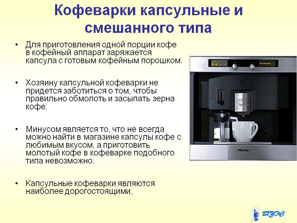 Для приготовления кофейных напитков в домашних условиях можно выбрать один из следующих видов кофеварок: