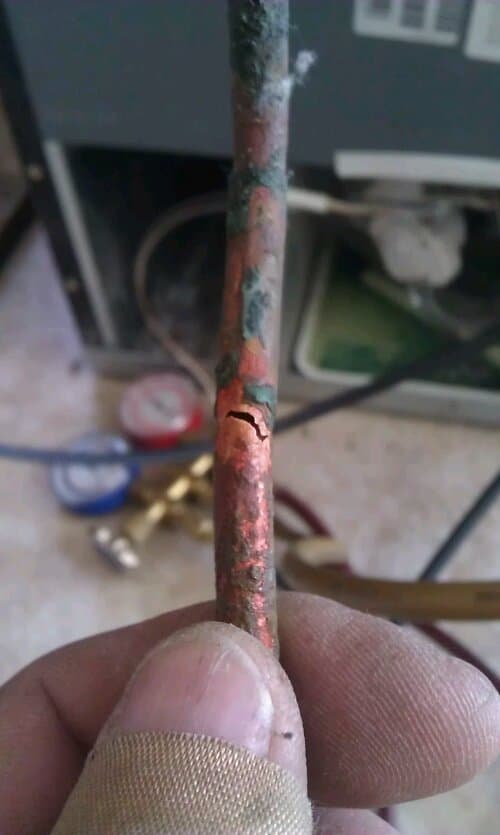 Утечки фреона типичны для небольших отверстий и проявляются через недели или месяцы. Как только отверстие образуется, оно медленно растет. В крайнем случае, если сварной шов разорвется, вы заметите это в течение нескольких дней, это может произойти, если наружные линии фреона попали в садовый инструмент или на чердаке, если кто-то наступил / ударил линию фреона.