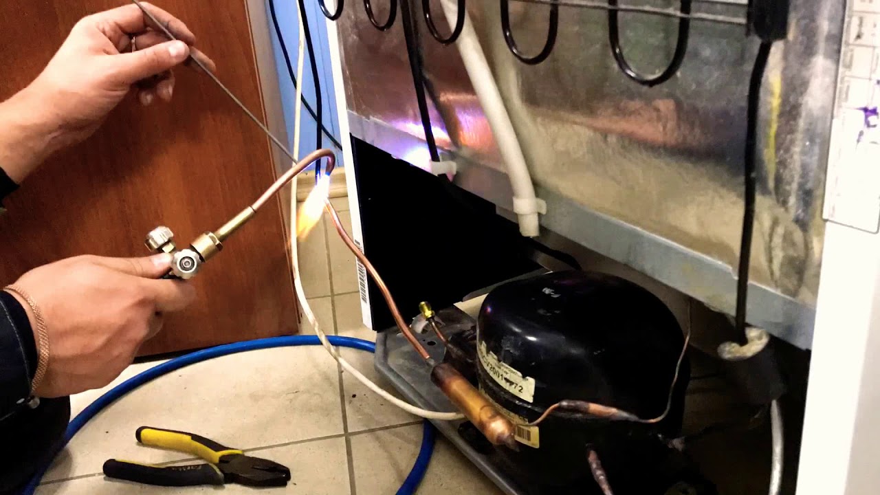 Ремонт утечки фреона в холодильнике они производят следующим образом: