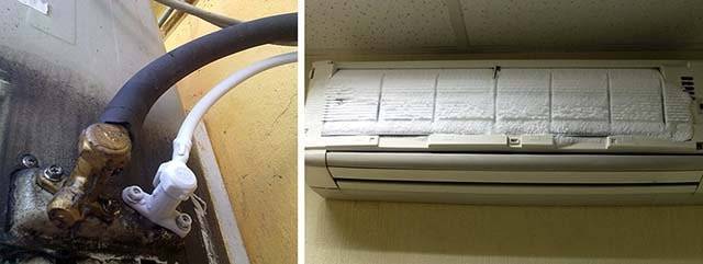 - В месте соединения труб магистрали с наружным блоком образуется иней или лед.