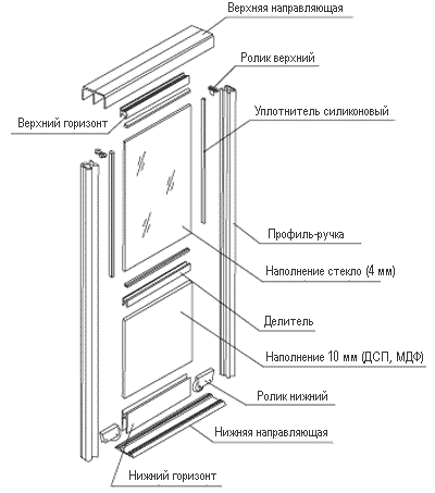 Стандартный шкаф купе состоит из крыши, боковин, перегородок, дна, потолка, цоколя, дверей, задней стенки и внутреннего наполнения.